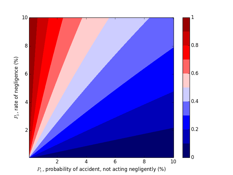 We were able to "flip" the outcome by flipping $P_1$ and $P_3$, so let's look at the probability of negligence as we vary those two variables. Plots can be generated with the following code.